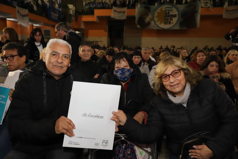 El Intendente Fernando Espinoza compartió el escenario con la Vicegobernadora Verónica Magario y el Ministro Larroque, quienes se mostraron emocionados por entregar en mano las escrituras a los vecinos.