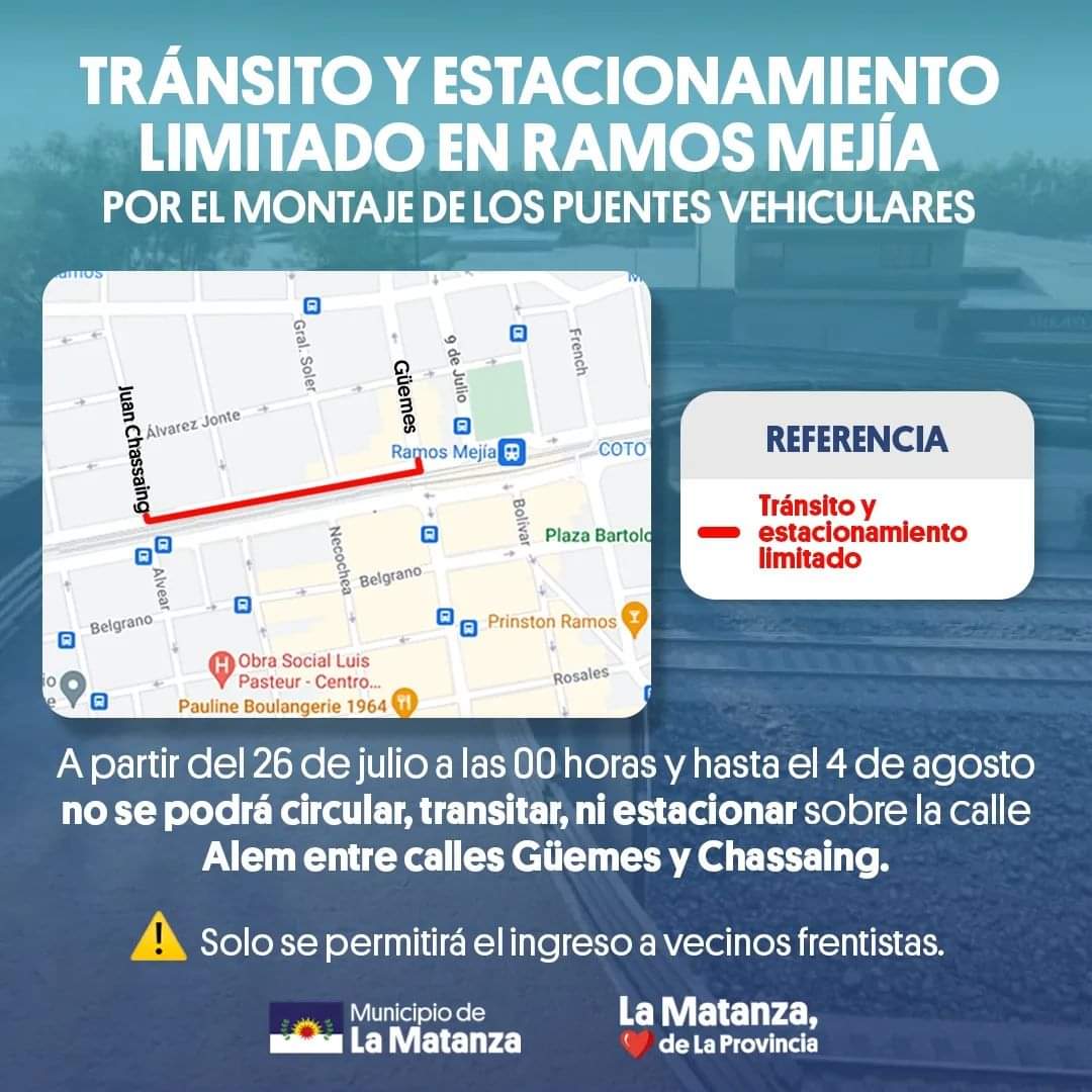 Desde el municipio de La Matanza, informaron que: «No se podrá transitar, estacionar ni circular por la calle Alem entre las calles Güemes y Juan Chassaing en Ramos Mejía».