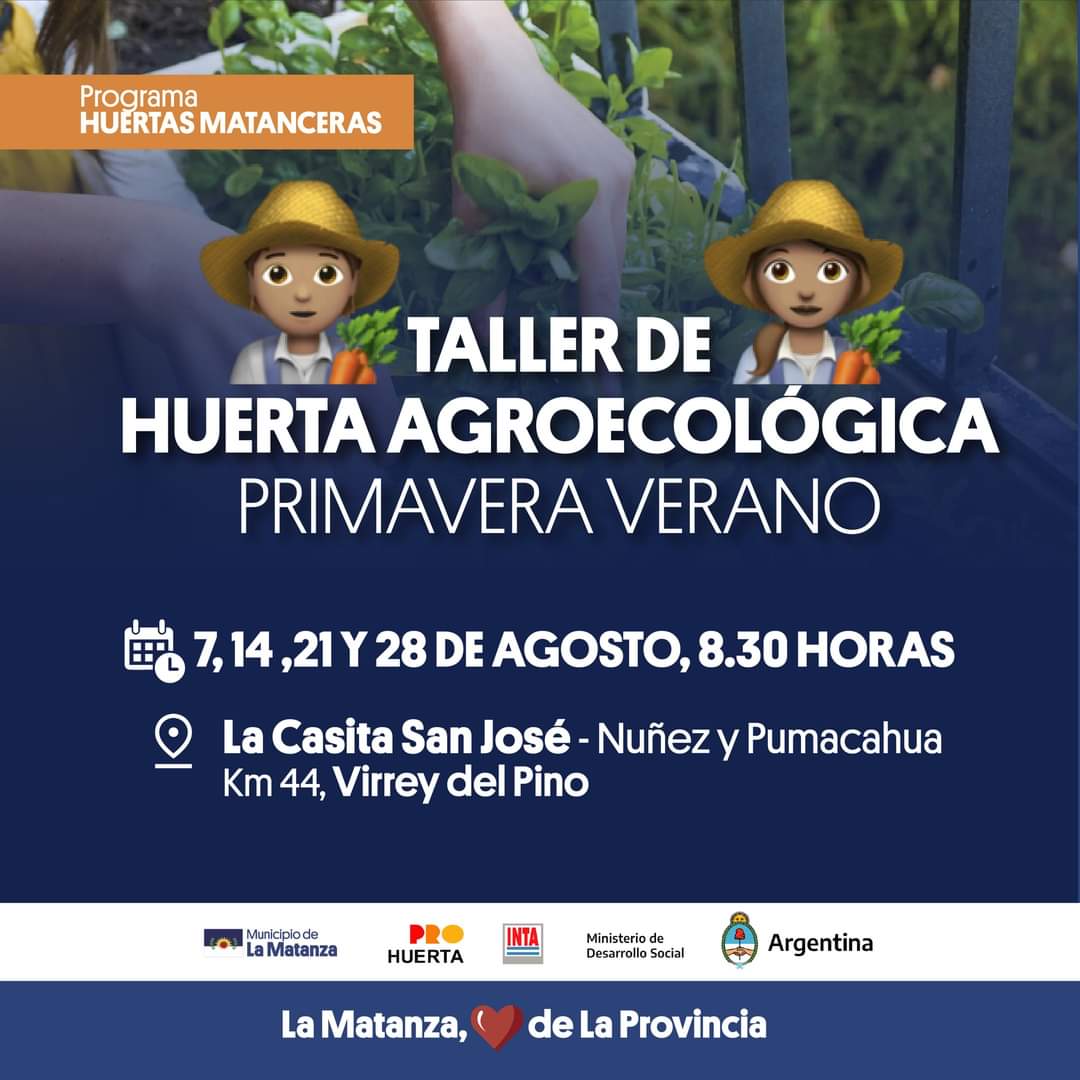 Los talleres se dictarán los días: 7, 14, 21 y 28 de Agosto de 8:30 a 11:30 Hs., en: La Casita San José, Nuñez y Pumacahua, km. 44 de la localidad de Virrey del Pino.