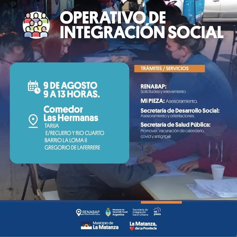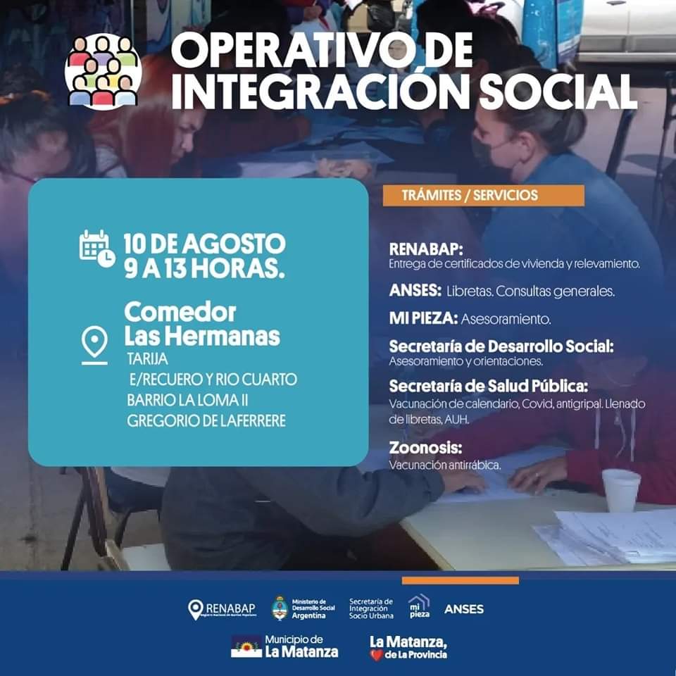 Los días 8, 9 y 10 de agosto 2023, en el horario de 9 a 13 hs., los operativos se realizarán en: Comedor las Hermanas, ubicado en Tarija, entre Recuero y Río Cuarto, barrio La Loma II, en la localidad de Gregorio de Laferrere