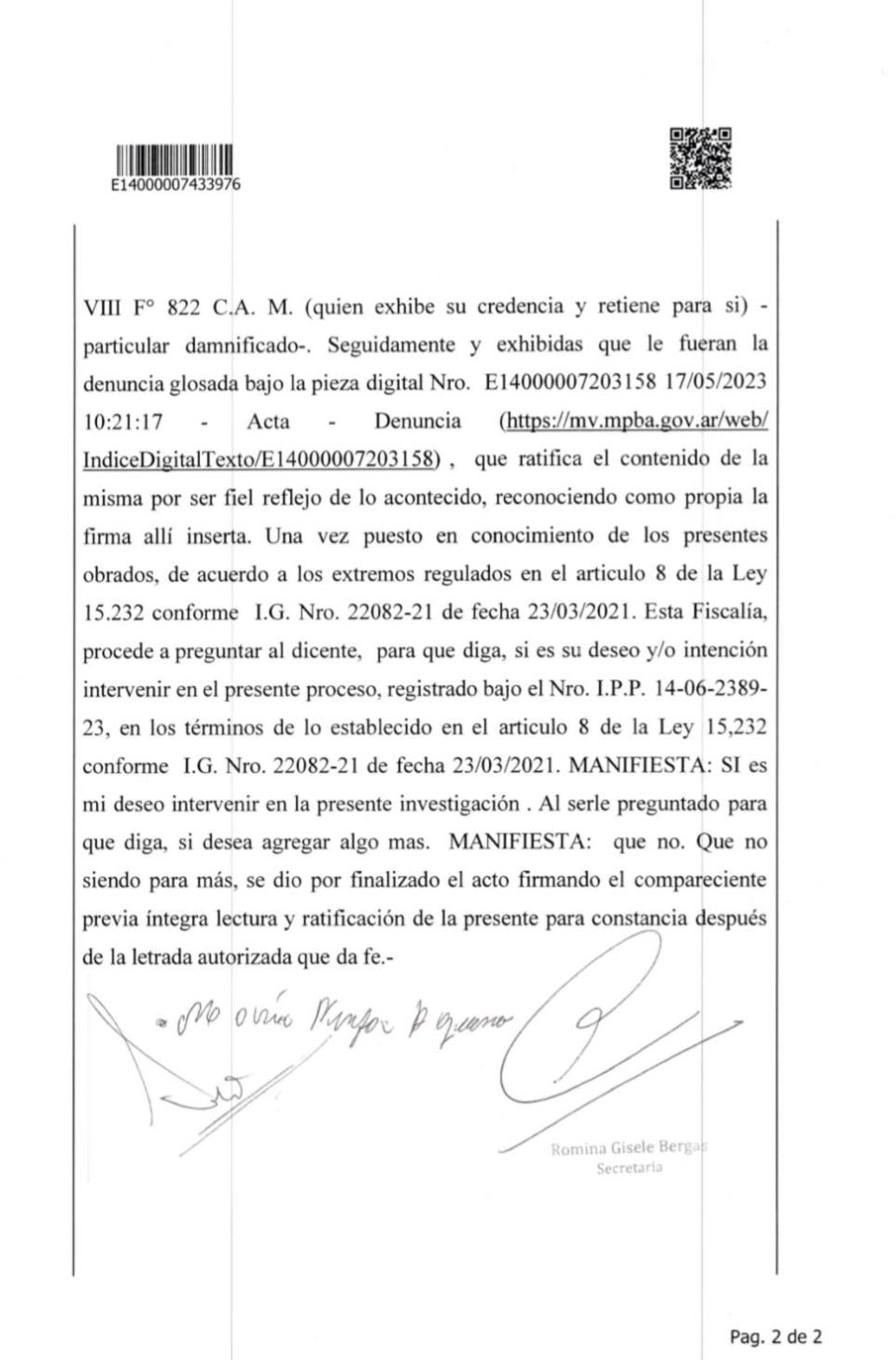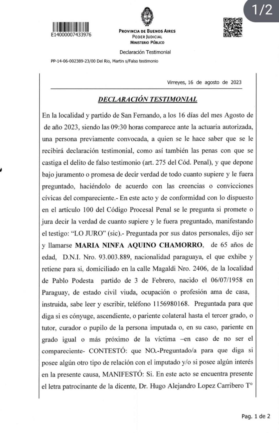 Finalmente Nina Aquino, junto a su abogado, el Dr. Hugo Lopez Carribero, ratificó la denuncia por falso testimonio agravado contra Martin Del Rio.