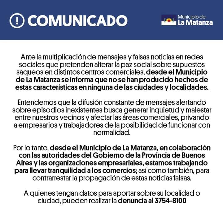 «Ante la multiplicación de mensajes y falsas noticias en redes sociales que pretenden alterar la paz social sobre supuestos saqueos en distintos centros comerciales, desde el Municipio de La Matanza se informa que no se han producido hechos de estas características en ninguna de las ciudades y localidades.