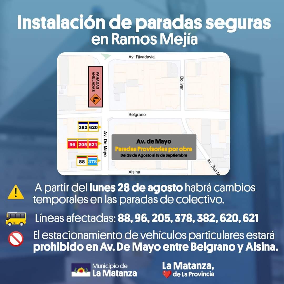 Y advirtieron que: «A partir del lunes 28 de agosto hasta el 18 de septiembre habrá cambios temporales en las paradas de colectivos».