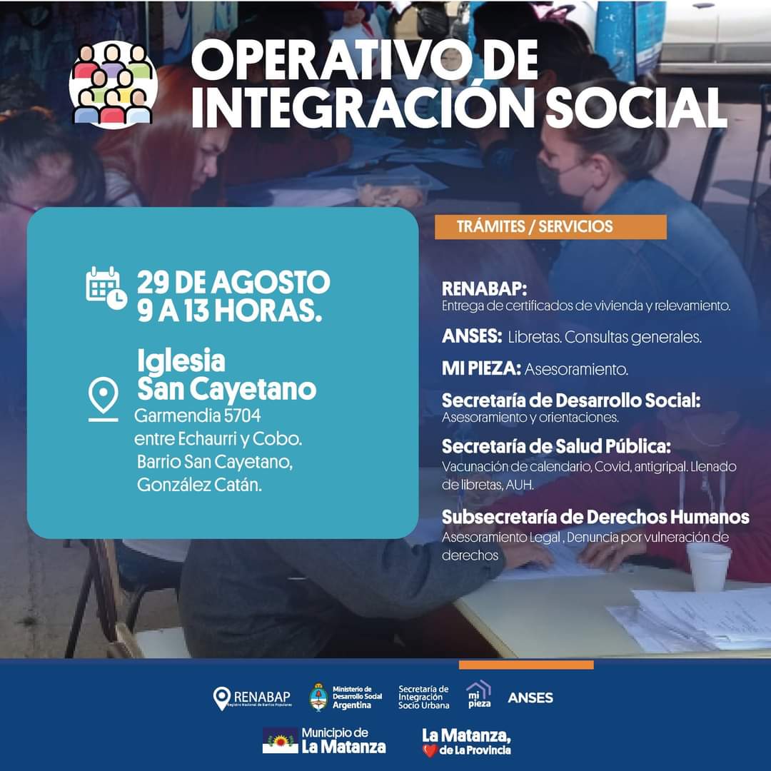 Los días 29, 30 y 31 de Agosto de 9 a 13 hs., podrás realizar trámites de: RENABAP, Anses, Mi Pieza, Secretaría de Desarrollo Social, Secretaría de Salud Pública y Derechos Humanos en: Iglesia San Cayetano, ubicada en la calle Garmendia 5704 (entre Echauri y Cobo), Barrio San Cayetano de González Catán.