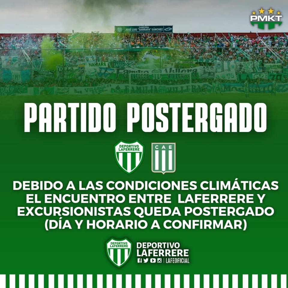 Partido suspendido por una intensa lluvia que dejó en estado de anegamiento el campo de juego, donde Deportivo Laferrere se disponía a enfrentar a Excursionistas en un esperado duelo.