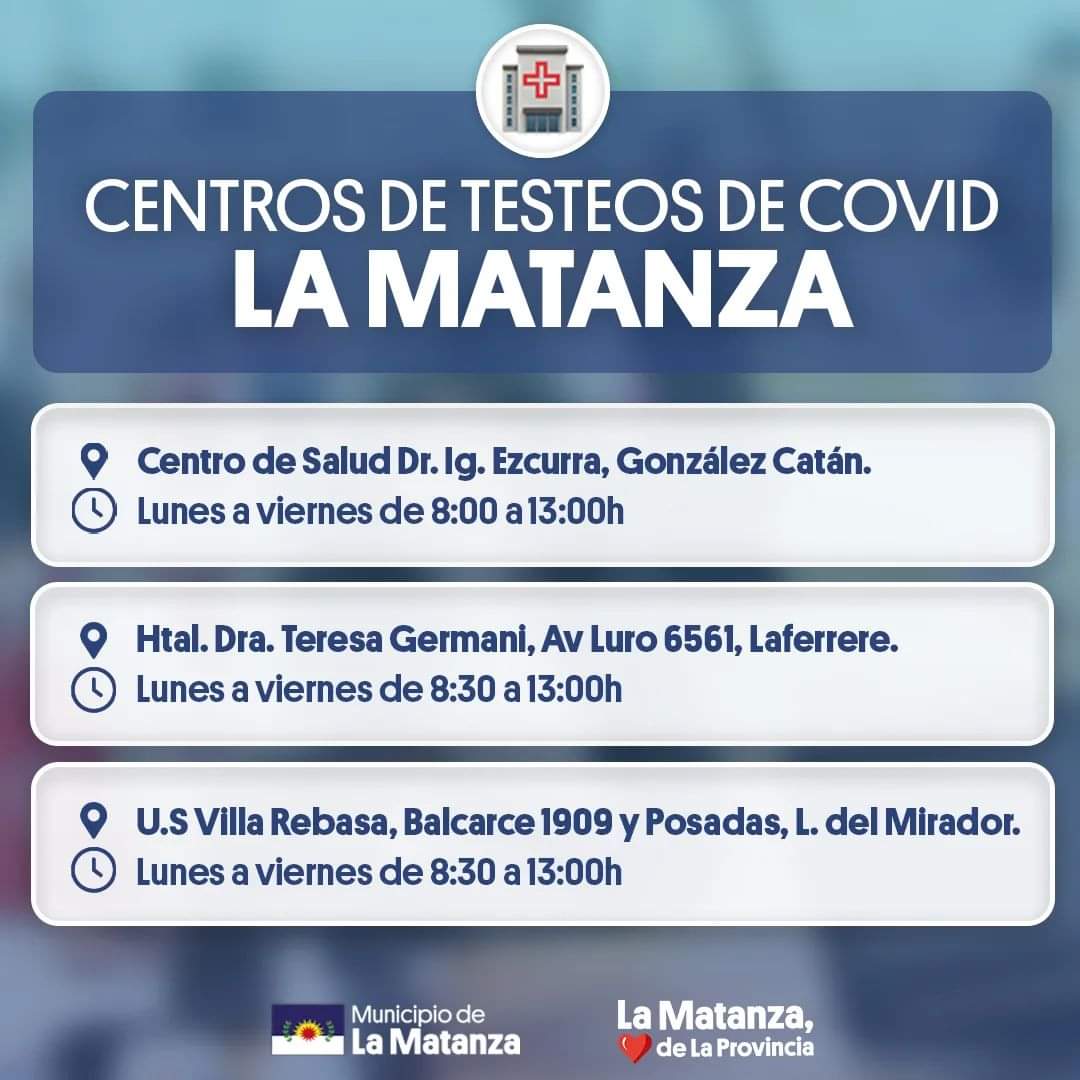 Desde el municipio de La Matanza, a través de la Secretaría de Salud, advirtieron: Recordá que están a disposición y en funcionamiento nuestros 3 Centros de Testeos distribuidos estratégicamente para: