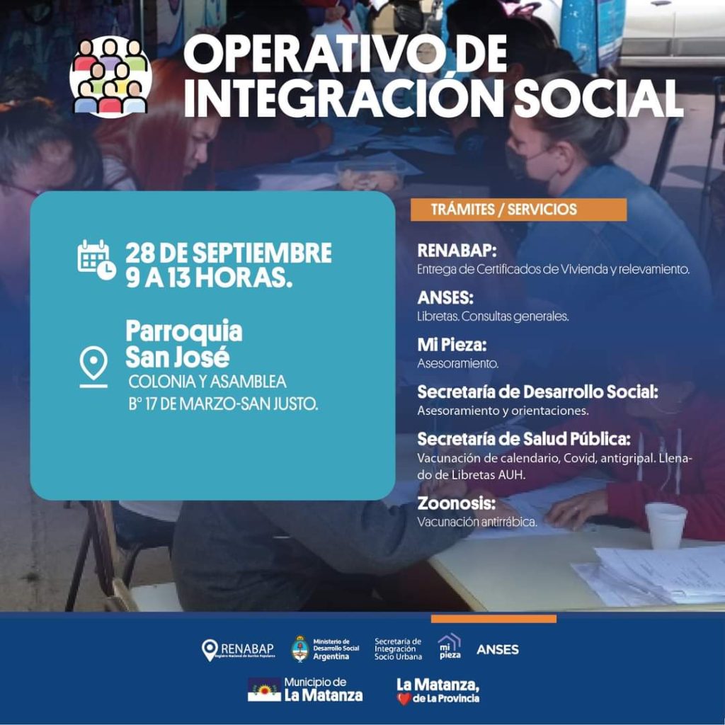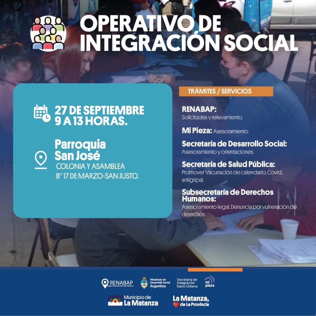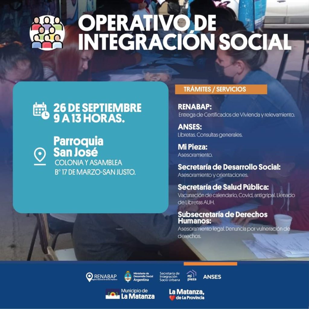 Los Operativos de Integración Social tendrán lugar los días 26, 27 y 28 de Septiembre en el horario de 9 a 13 hs., en la Parroquia San José, en la calle Colonia y Asamblea, en el Barrio 17 de Marzo, en la localidad de San Justo.