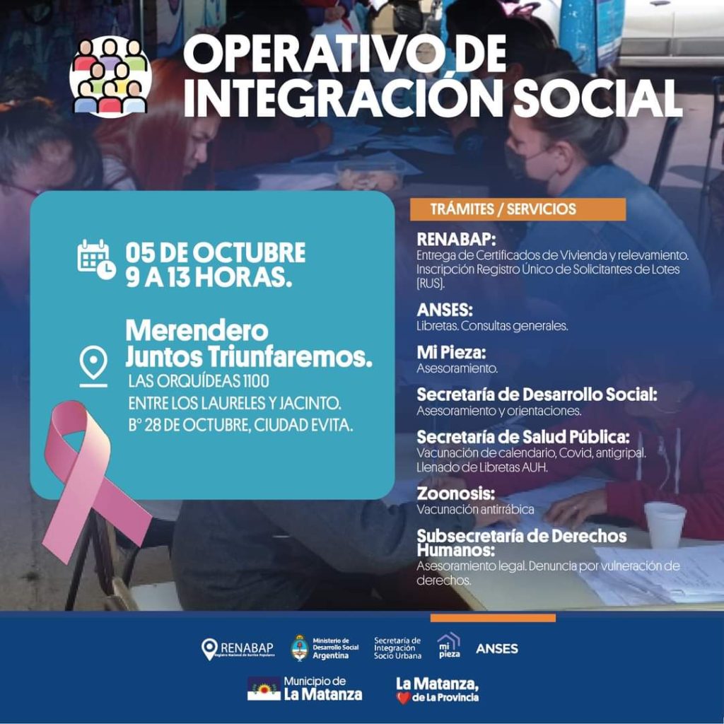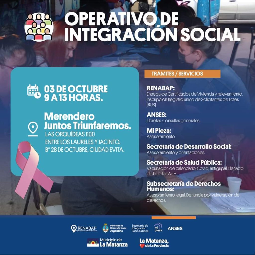 En el Merendero Juntos Triunfaremos, ubicado en Las Orquídeas al 1000 (entre Los Laureles y Jacinto), Barrio 28 de Octubre en Ciudad Evita, los días 3, 4 y 5 de Octubre en el horario de 9 a 13 hs., se realizarán los Operativos de Integración Social,
