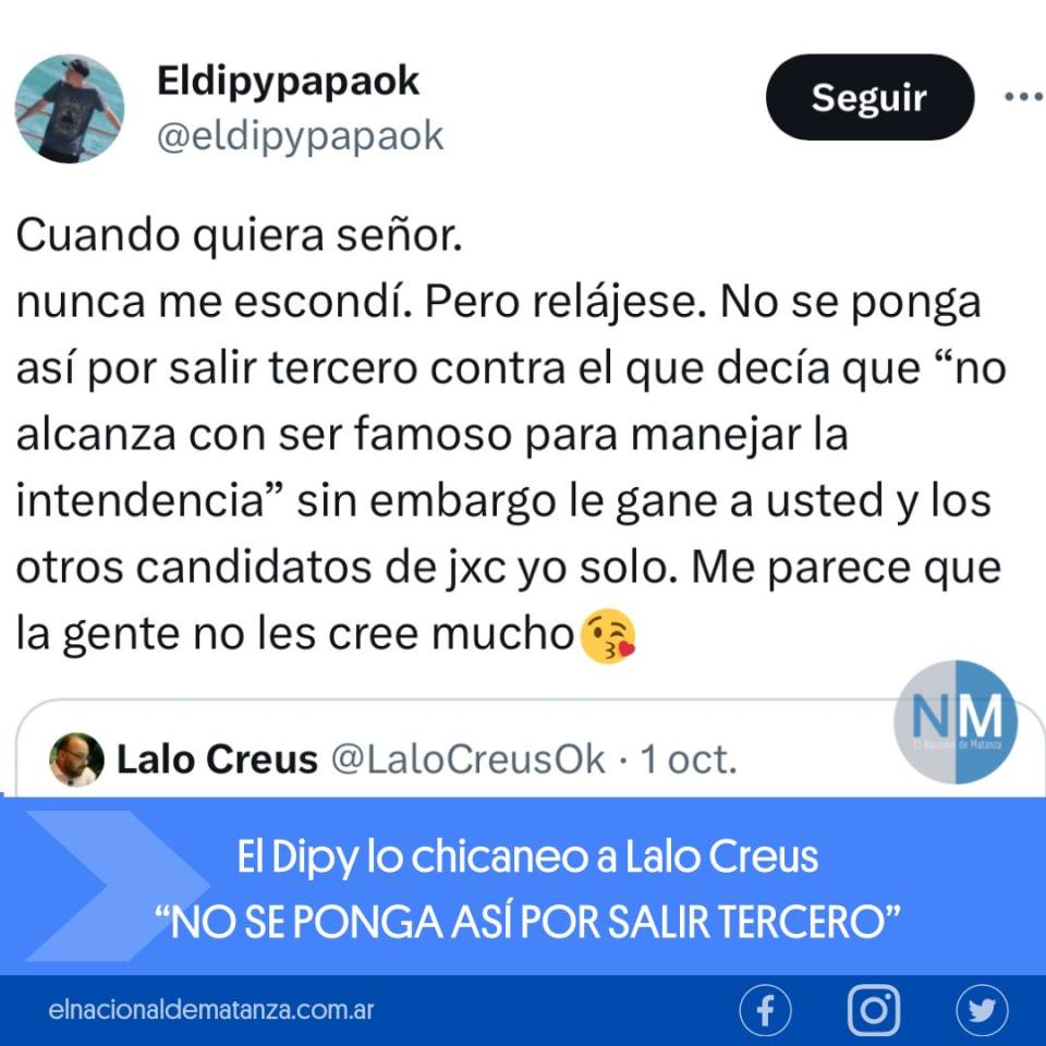 La respuesta de «El Dipy» no se hizo esperar. En su cuenta de Twitter, escribió: «Cuando quiera señor», dejando claro su interés por el desafío. Además, agregó: «Nunca me escondí», insinuando que está dispuesto a discutir públicamente. Sin embargo, su comentario no estuvo exento de provocación: «Pero relájese. No se ponga así por salir tercero contra el que decía que ‘no alcanza con ser famoso para manejar la intendencia'».