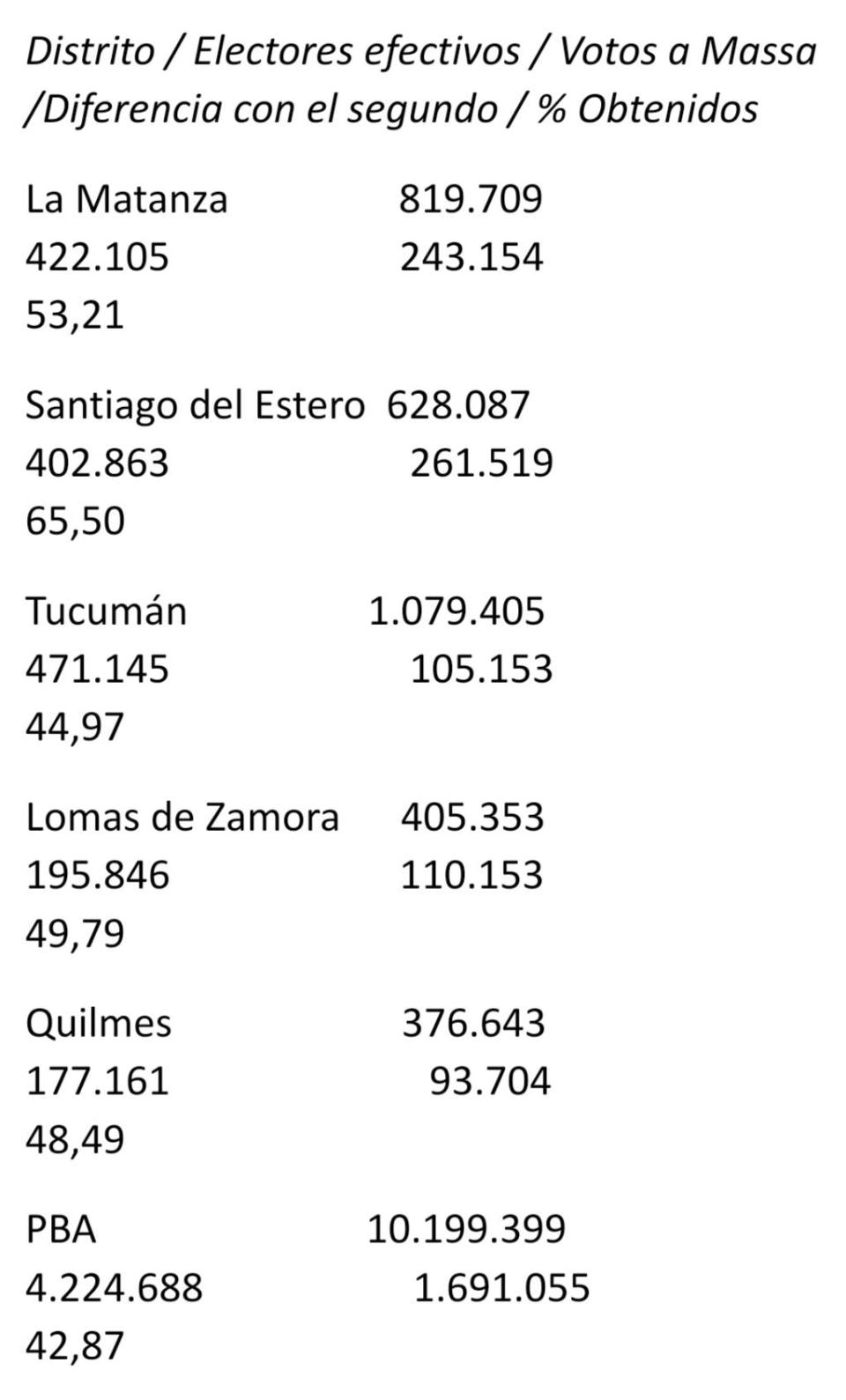 Dentro del podio de mayores aportes al triunfo de Massa, la Matanza superó a Santiago del Estero en votos efectivos (422.105 a 402.863) para UxP y estuvo muy por arriba de Tucumán en diferencia de votos para Massa sobre Milei (243.154 a 105.153).