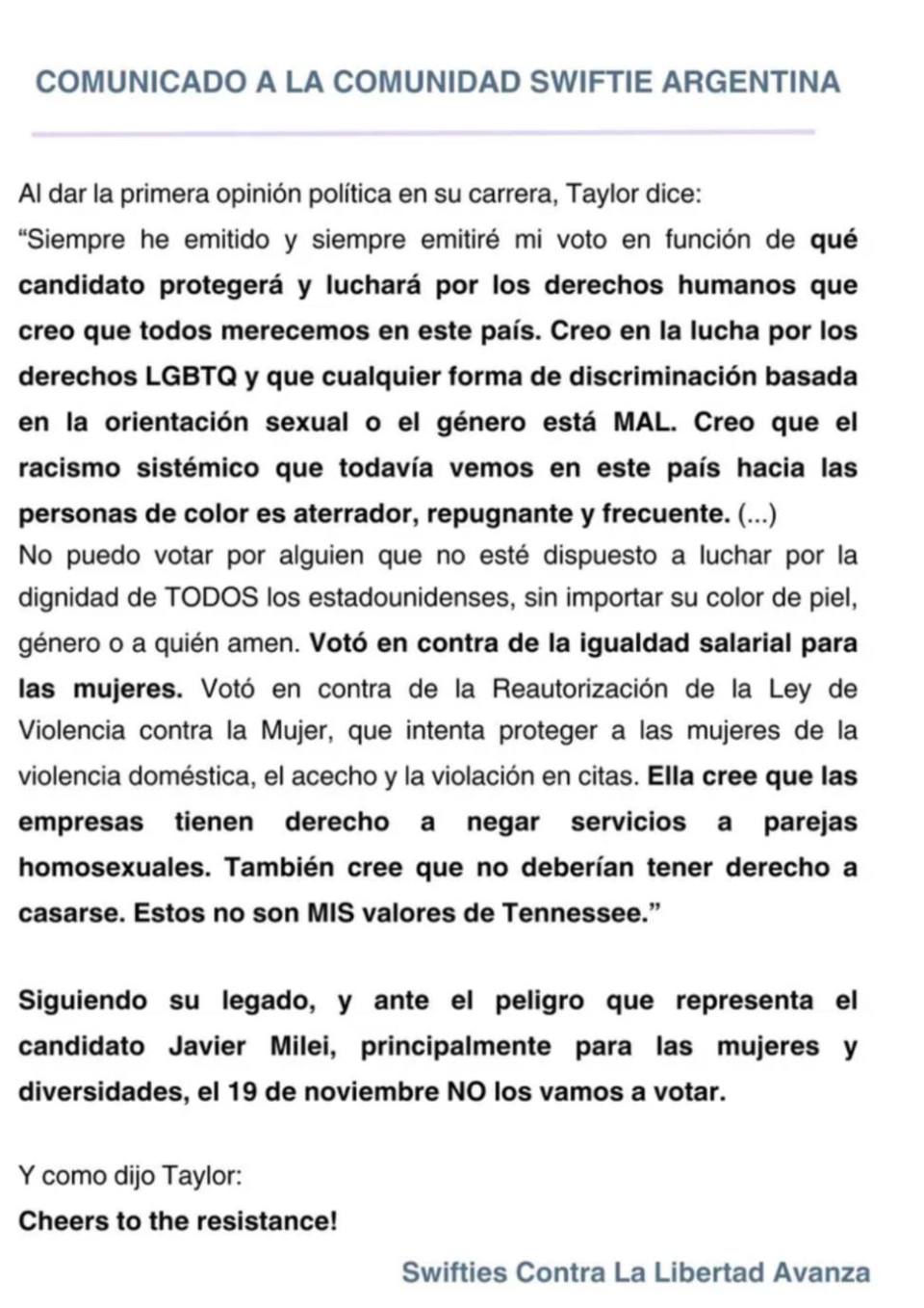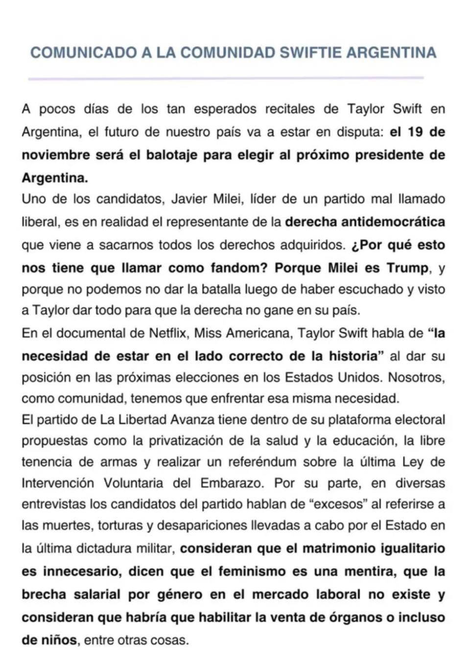 En el comunicado, las «Swifties» argumentan que Milei representa la derecha antidemocrática y que amenaza con eliminar los derechos adquiridos.