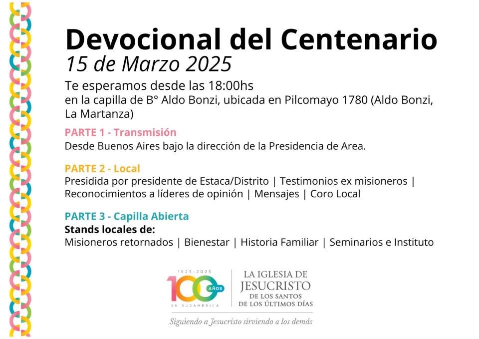 La celebración se llevará a cabo el sábado 15 de marzo de 2025, a las 18:00 horas, en el Centro de Reuniones de la Iglesia, ubicado en Pilcomayo 1780, Barrio Aldo Bonzi. Durante la ceremonia, que será transmitida en vivo a más de 100 ciudades del país, se destacará el crecimiento de la Iglesia en la región y se expresará gratitud por la libertad religiosa en Argentina.