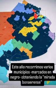 Luego bajé por Luján, Mercedes, Suipacha y Chivilcoy, y me interné hacia el oeste: Junín, Lincoln, Bragado, Carlos Casares, Bolívar, Olavarría, hasta Bahía Blanca. Desde allí regresé por Mar del Plata y continué por Balcarce, Tandil, Azul, Saladillo, Lobos, General Belgrano, Dolores y los municipios costeros. Retornando a Mar del Plata.