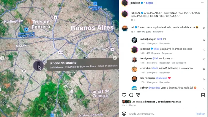 Tras su presentación, la artista compartió un resumen de su paso por el país y mostró la ubicación del dispositivo sustraído, que señalaba el partido de La Matanza. La publicación generó múltiples reacciones, entre ellas la de Lali, quien bromeó sobre haberla ayudado a ubicar la zona. Judeline respondió con afecto: “Te amo, Dios mío”.