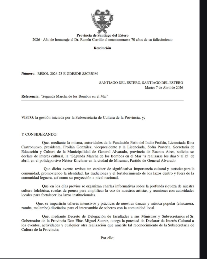 Asimismo, se reconoció a la provincia de Santiago del Estero y a su Subsecretaría de Cultura por declarar de interés cultural la II Marcha de los Bombos en Miramar, consolidando su relevancia institucional.